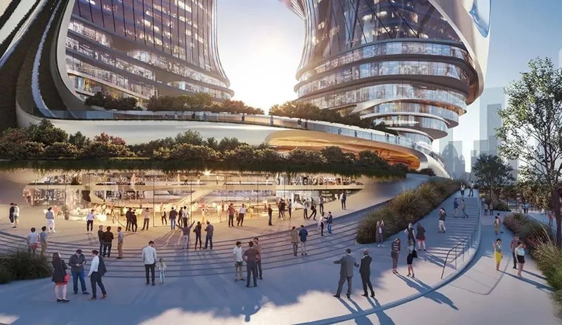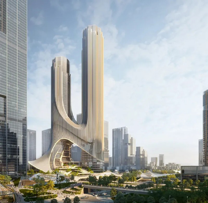扎哈事務所的設計旨在創造一個新的地標,一組新的可識別的塔,讓建筑本身成為一個公共事件。方案完美地回應了深超總城市規劃設計的“十字生境”理念,并與周邊的公園和廣場建立了直接的聯通關系——裙房梯田狀的空間形態將中央綠軸自然地引入裙房公共空間,提供直接的連續感,并通過塔樓設計使該空間不斷上升,使建筑整體與綠軸景觀無縫連接。