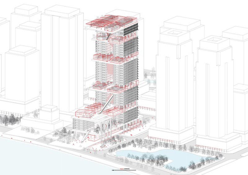 其標(biāo)志性設(shè)計(jì)包括4道單邊懸挑景觀平臺(tái),形似“火箭發(fā)射臺(tái)”,創(chuàng)下國(guó)內(nèi)超高層直挑結(jié)構(gòu)首例。