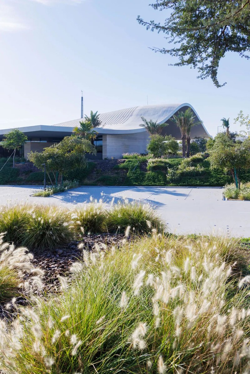 建筑的波浪形屋頂象征女性持續向上、自我成長的力量。兩棵橄欖樹穿過屋頂結構、向天而立,寓意和平與生命的延續。室內外空間通過庭院與花園過渡連接,強化了人與自然的精神交匯,為來訪者提供安靜冥想與社區互動的可能。